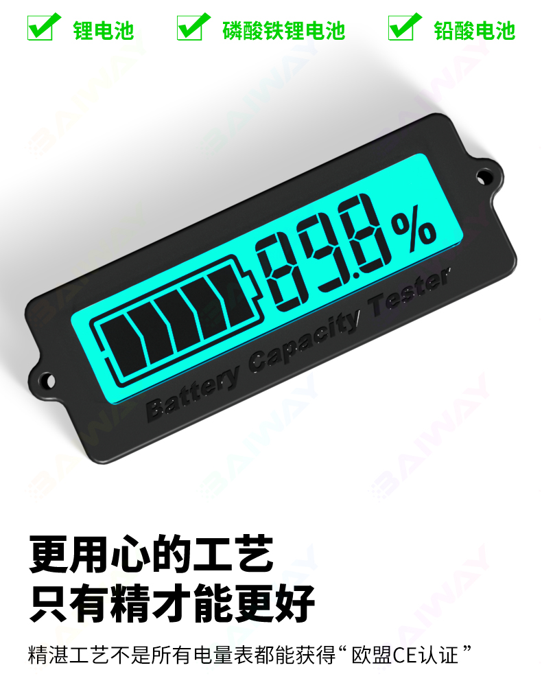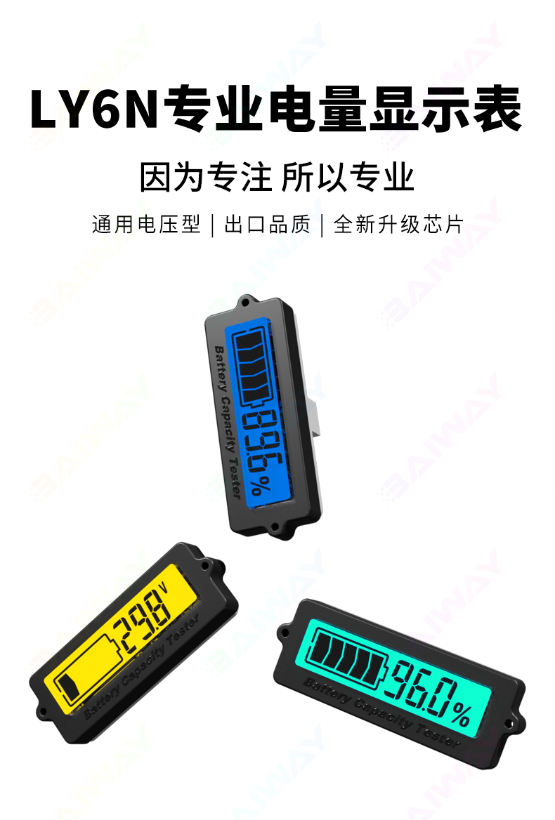 LY6N详情展示 LY6N 通用电压型电量表 用于检测电池组的剩余容量,并以直观的电池符号和百分比显示,及时了解电池使用状态。适用于各种仪器仪表、测量设备、移动便携设备、扫地机、平衡车、电瓶车等。 工作电压:8~ 66V 工作功耗:5.0mA 温度范围:-10 ~ 50℃ 产品重量:17g 查看说明书 产品详情展示