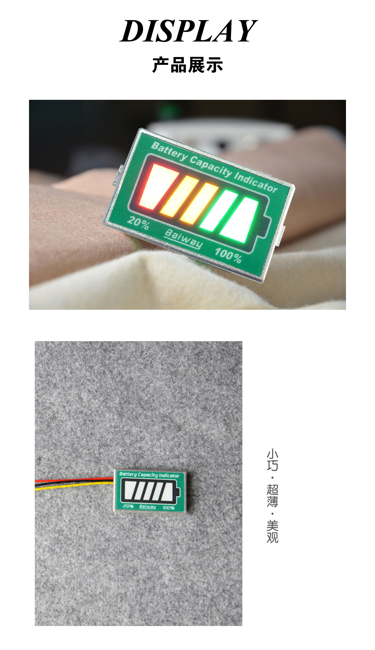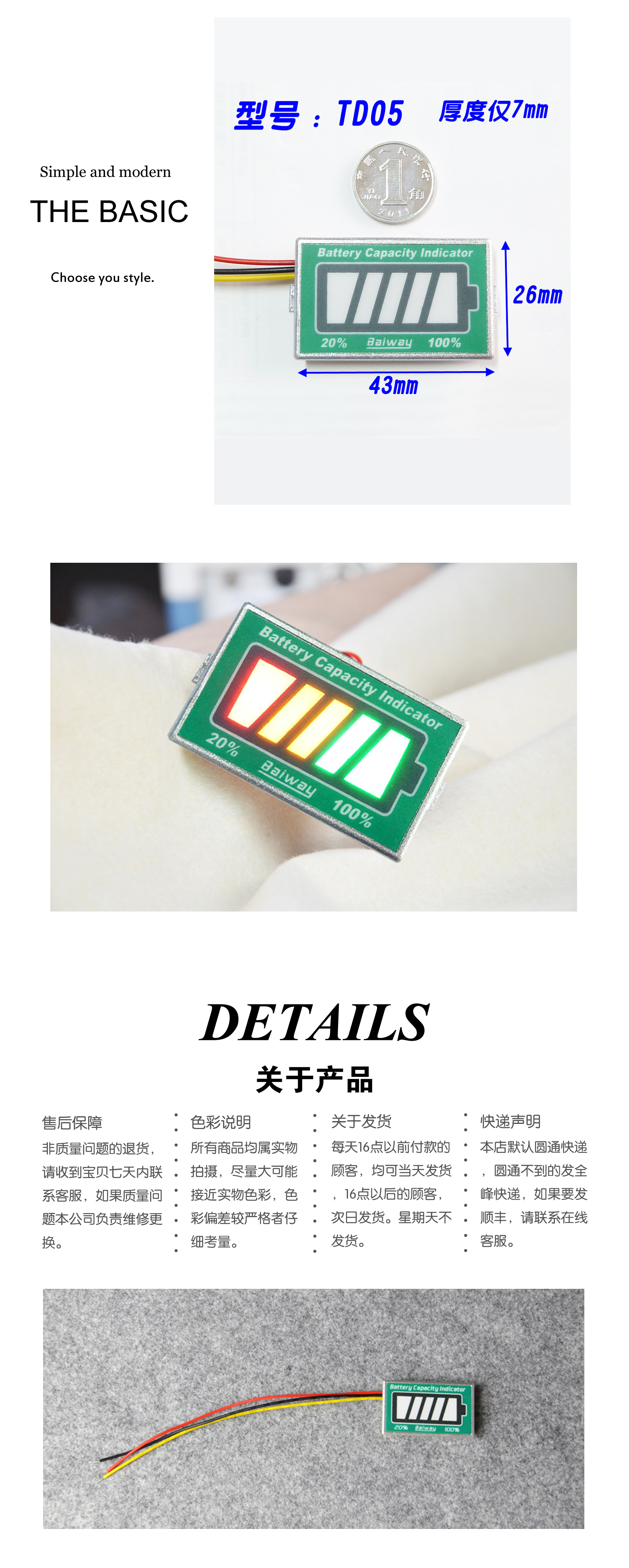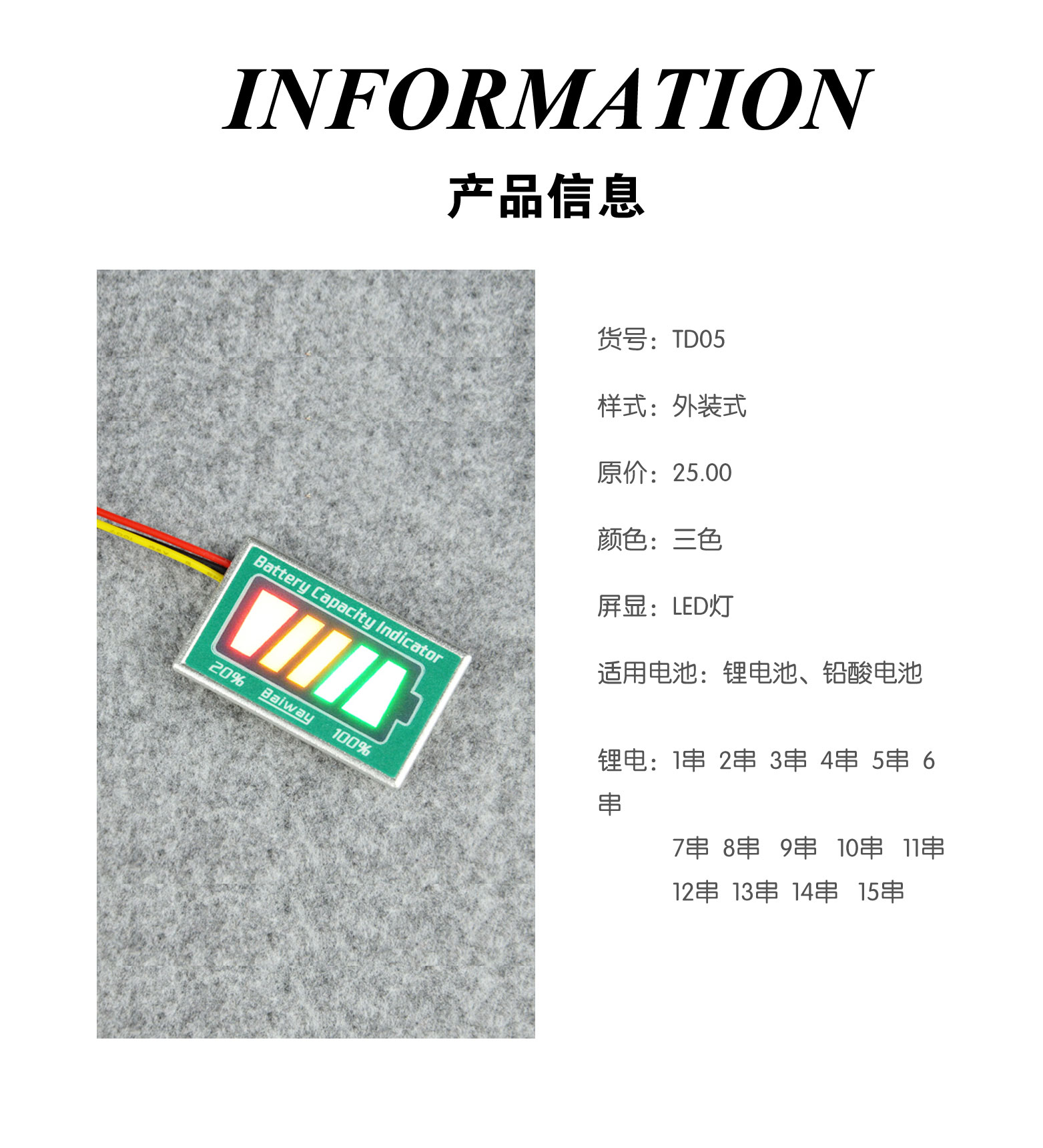 TD05详情展示 TD05轻薄LED电显 TD05是一款电压型电量指示器。它能够实时检测电池组的剩余容量,并根据剩余容量显示不同颜色的LED灯。适用于移动便携设备、平衡车、电动车、吸尘器、测量设备、医疗设备、各种仪器仪表等。 温度范围:-10 ~ 60℃ 产品重量:10g 查看说明书 产品详情展示