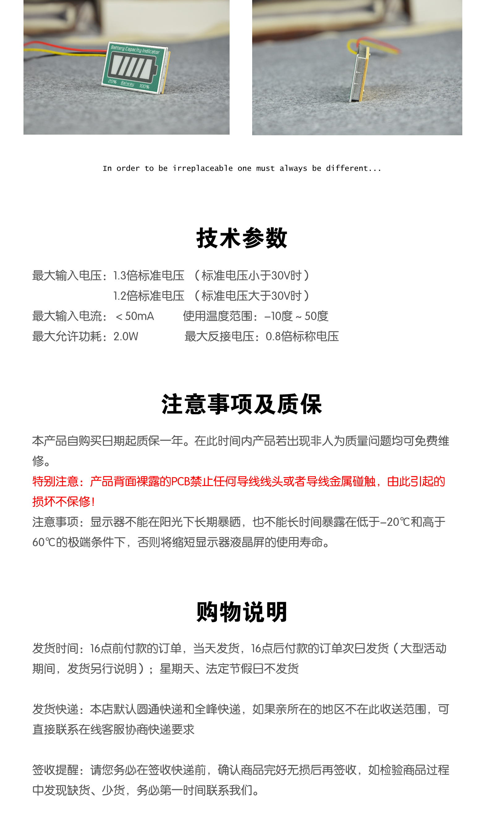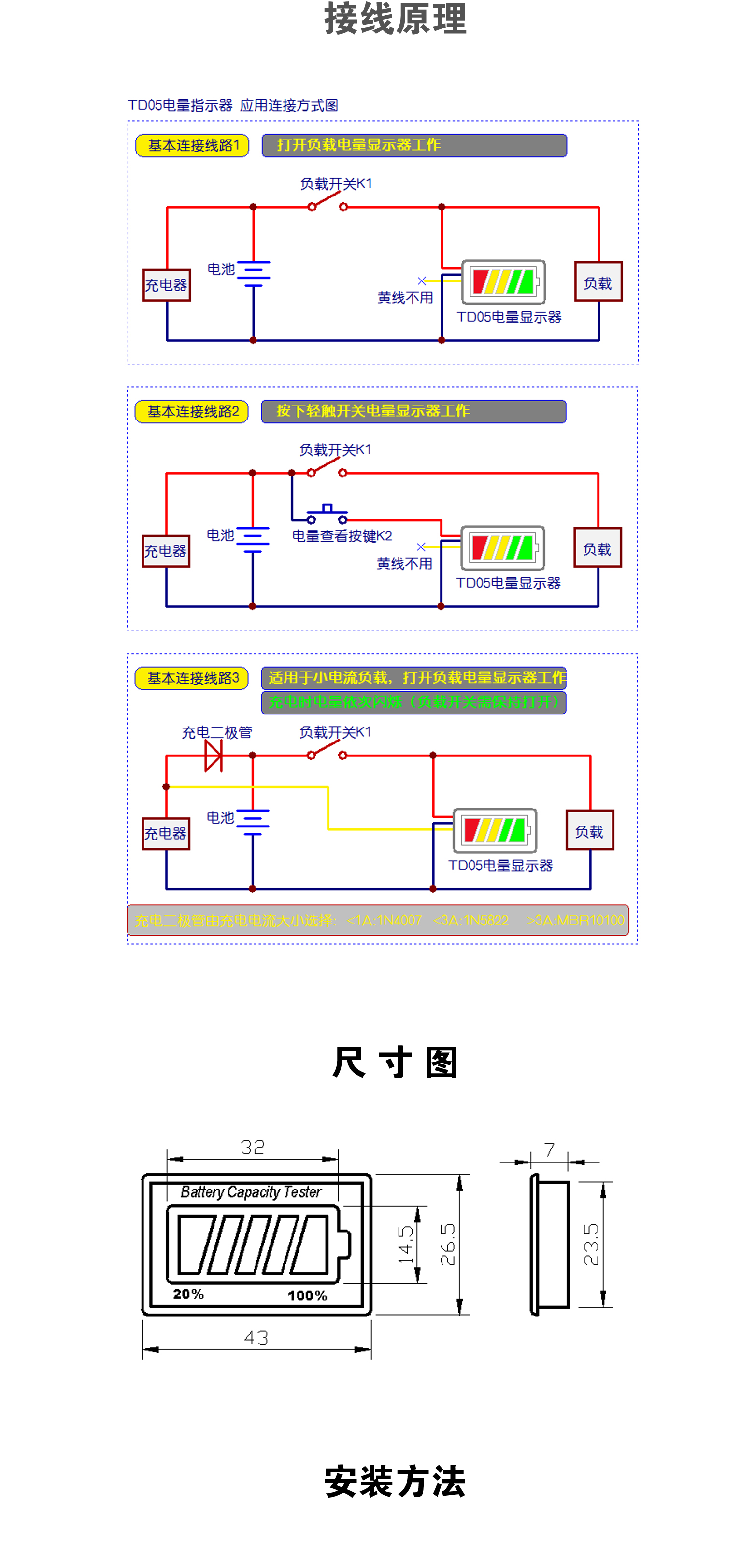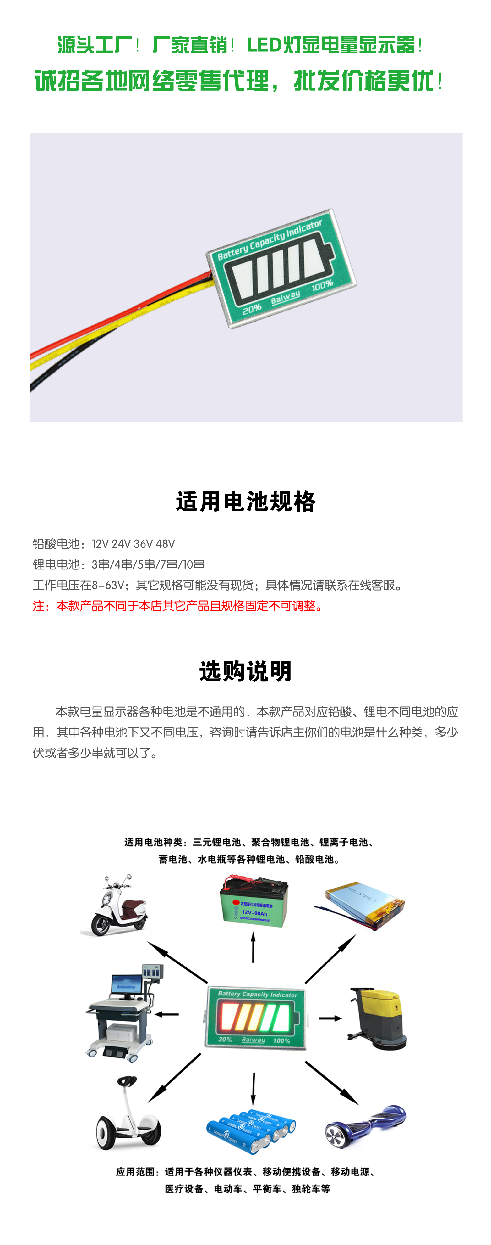 TD05详情展示 TD05轻薄LED电显 TD05是一款电压型电量指示器。它能够实时检测电池组的剩余容量,并根据剩余容量显示不同颜色的LED灯。适用于移动便携设备、平衡车、电动车、吸尘器、测量设备、医疗设备、各种仪器仪表等。 温度范围:-10 ~ 60℃ 产品重量:10g 查看说明书 产品详情展示