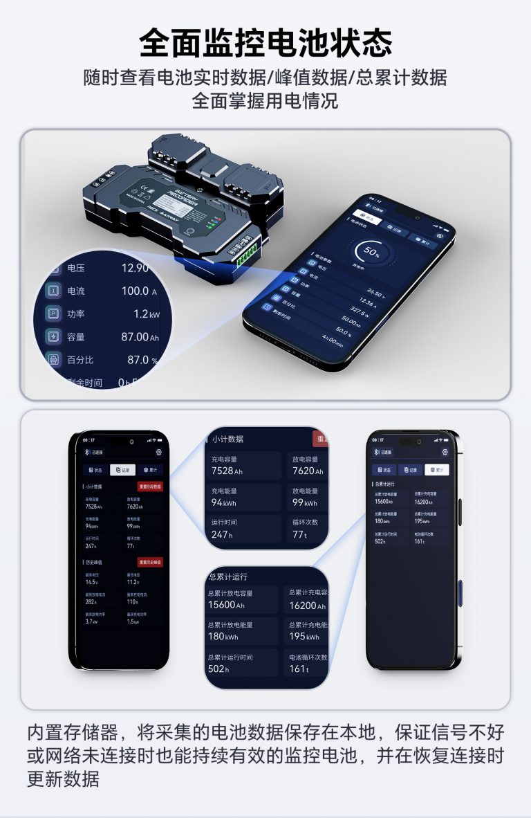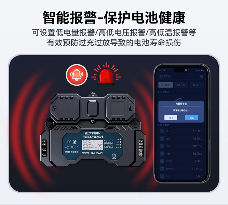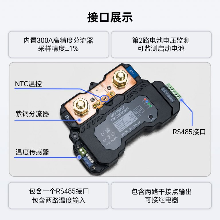 RECS采集模块详情展示 RECS内置采样电池信息采集模块 RECS为高性能电池数据采集模块,内置300A高精度采样器。 支持蓝牙/WiFi/4G等 内置300A采样器 历史数据存储/输出/导出 可各种应用场景搭配使用 RS485/UART通讯 两路控制输出 私有协议,高效通讯 产品详情展示